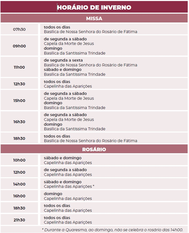 Apesar da entrada em vigor do horário de inverno, em alguns momentos, como na ocasião das celebrações natalícias, na Quaresma e na Semana Santa, o programa celebrativo sofrerá alterações específicas que, oportunamente, serão dadas a conhecer (no site do Santuário de Fátima: www.fatima.pt).